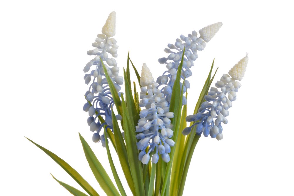 Bukiet jasno niebieskich sztucznych szafirków o lekkim, pastelowym odcieniu. Doskonały do tworzenia przyjemnej, uspokajającej atmosfery w pomieszczeniu.