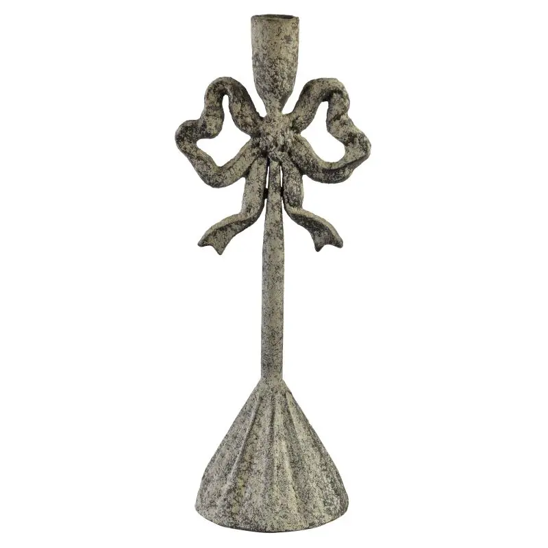 Świecznik o wymiarach 12x9,5x30,5cm to wyjątkowa dekoracja wykonana z metalu, ozdobiona subtelną kokardą, która nadaje mu lekkości i elegancji. Idealnie sprawdzi się jako oprawa dla świecy stołowej, tworząc ciepły i nastrojowy klimat w każdym wnętrzu. Jego charakterystyczny design wpisuje się w styl rustykalny, dzięki czemu doskonale komponuje się zarówno z klasycznymi, jak i bardziej naturalnymi aranżacjami. To przedmiot, który nie tylko pełni funkcję praktyczną, ale także stanowi efektowny element dekoracyjny . świetnie prezentuje się na stole, komodzie czy parapecie, podkreślając przytulny, domowy charakter przestrzeni.