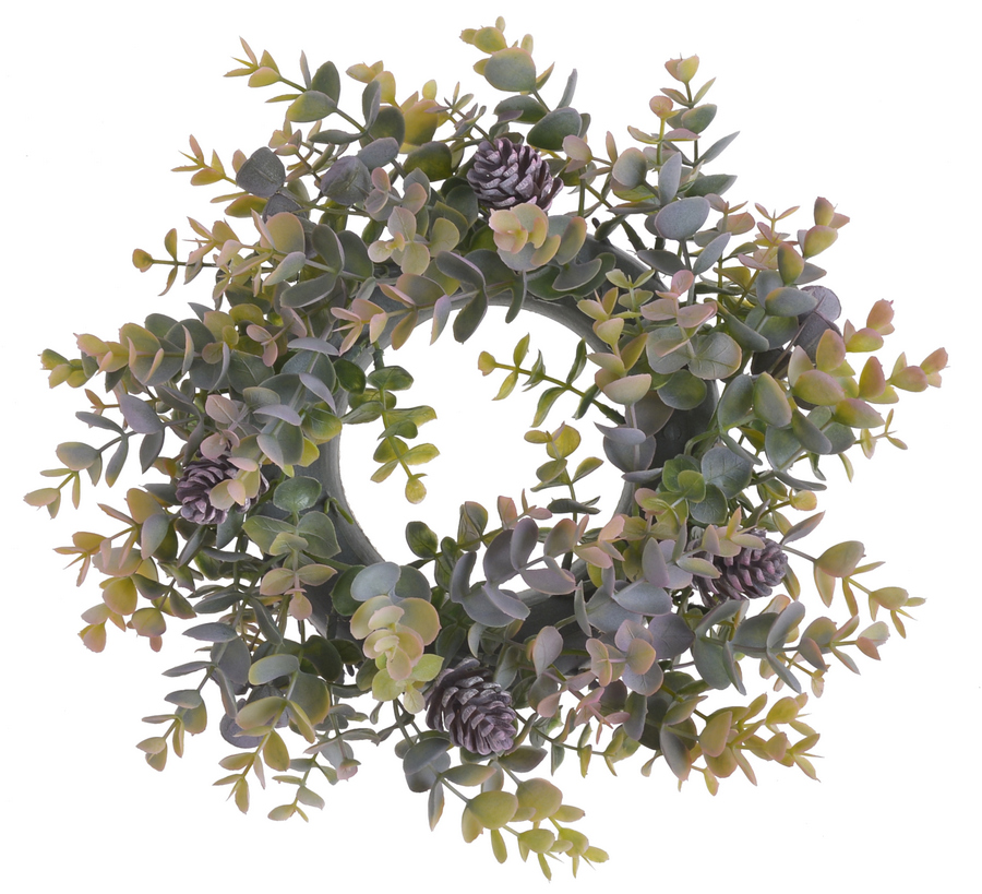 Wianek z eukaliptusa o średnicy 30 cm, ozdobiony szyszkami, to subtelna i naturalnie wyglądająca dekoracja. Doskonale sprawdzi się na drzwiach, ścianie lub jako element stołowych aranżacji, wprowadzając do wnętrza świeży, leśny klimat.