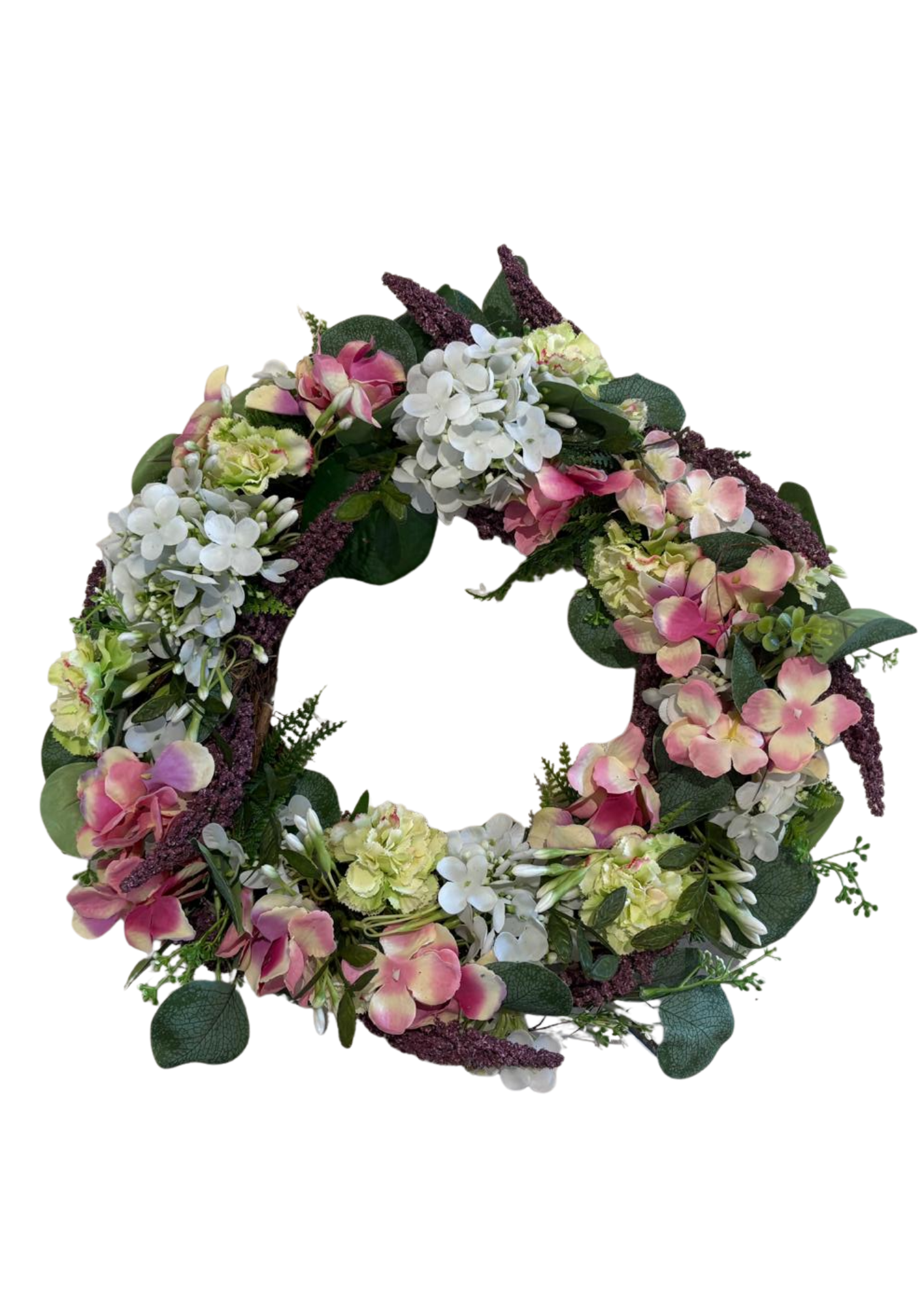 Elegancka dekoracja, która zachwyca naturalnym wyglądem i delikatną kolorystyką. Starannie wykonany z wysokiej jakości sztucznych kwiatów, doskonale sprawdzi się jako ozdoba drzwi, ściany lub stołu, wprowadzając do wnętrza świeżość i styl.
