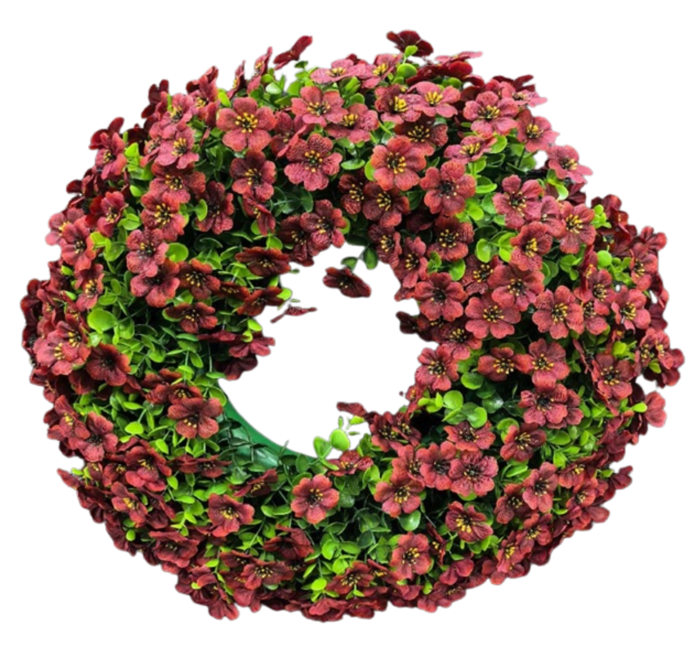 Dekoracyjny wianek o średnicy 50 cm, wykonany ze sztucznych kwiatów bodziszka w głębokim, burgundowym odcieniu. Gęsta, naturalnie wyglądająca kompozycja dodaje charakteru i ciepła każdemu wnętrzu czy przestrzeni ogrodowej. Idealny na drzwi, stół lub ścianę – sprawdzi się w stylu rustykalnym, boho czy klasycznym, zarówno przez cały rok, jak i w sezonowych aranżacjach.